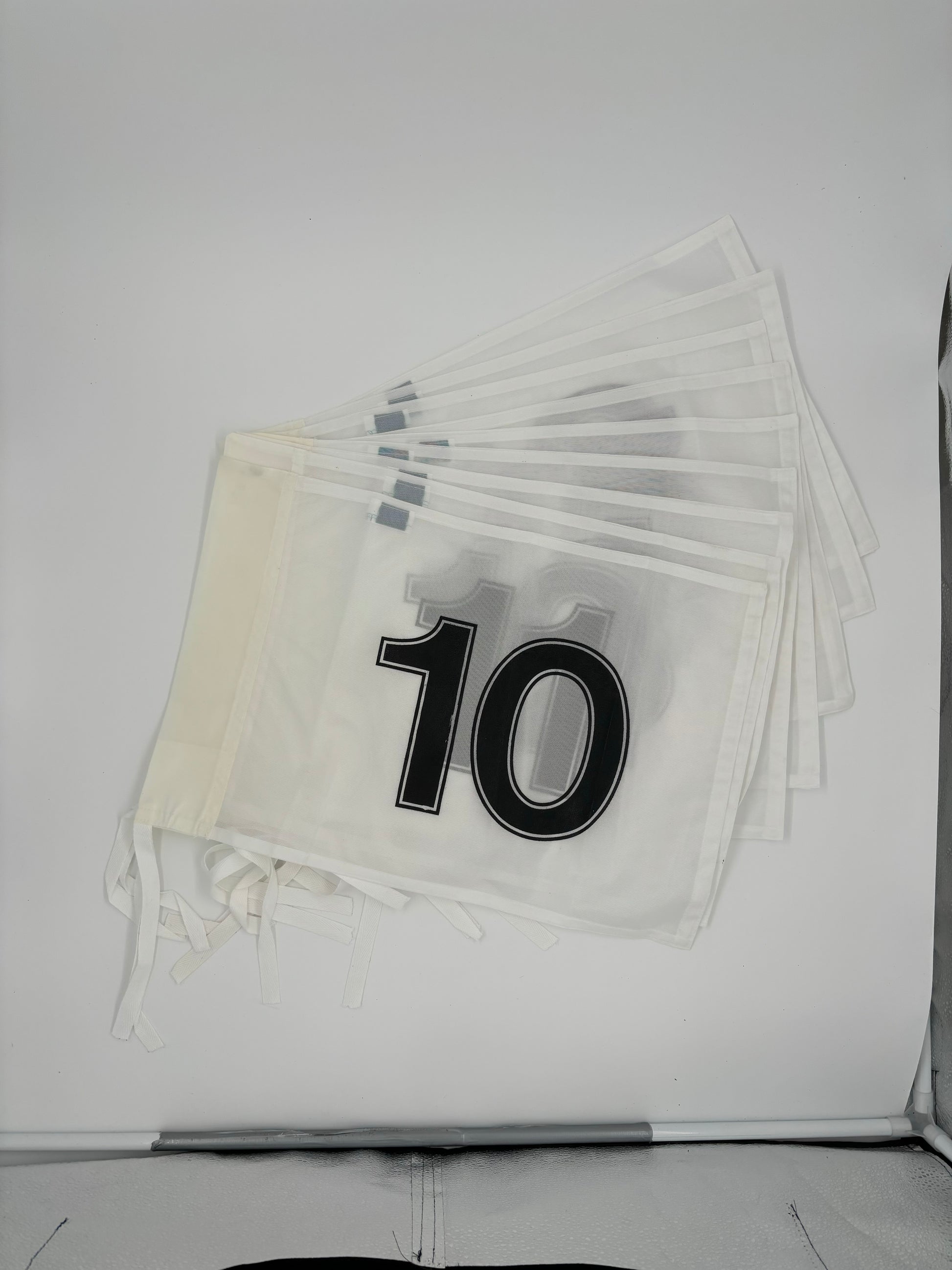 High-quality white tie-on golf flag, ideal for course greens. Durable, weather-resistant material with strong stitching. Bulk pricing available – order today!