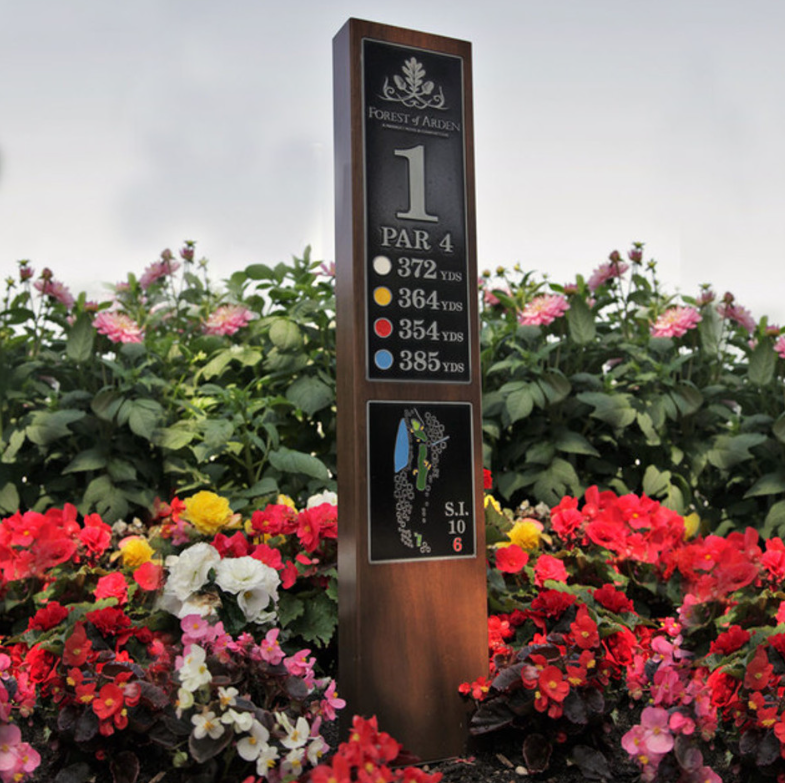 Iroko Hardwood Tee Post with Etched Zinc Plaques.